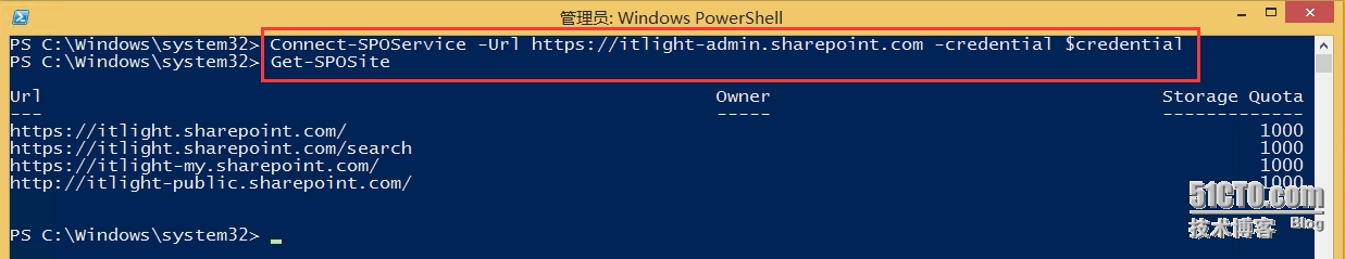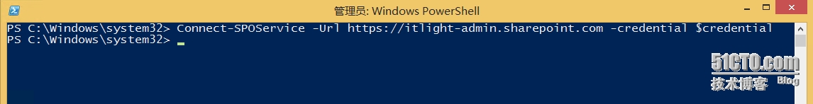 - 运行命令” Connect-SPOService -Url https://itlight-admin.sharepoint.com -credential $credential” 连接至SharePoint Online.
