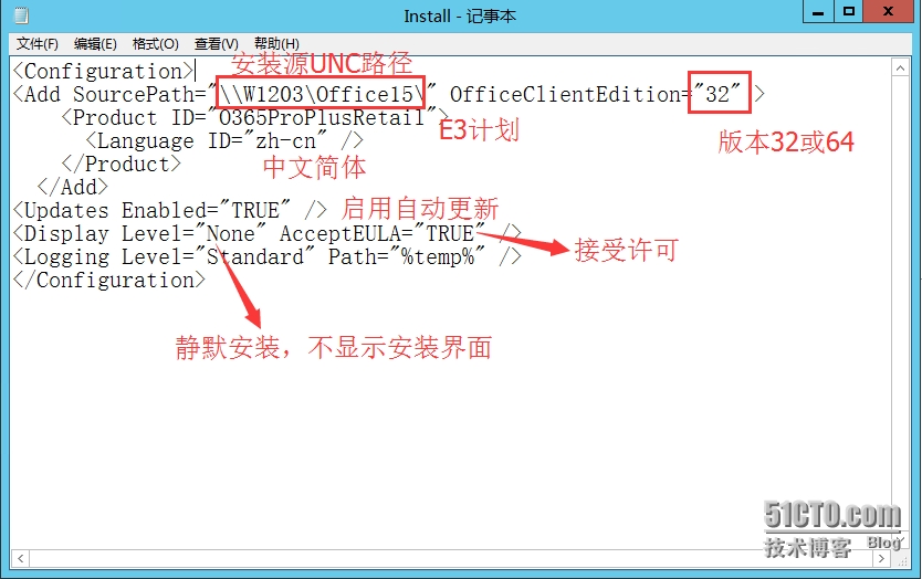 此 Configuration.xml 配置文件指定将 32 位中文简体版的 Office 365 ProPlus 下载到 \\W1203\Office15 共享文件夹中 。(我们可以修改这三个参数以下载不同版本的Office 365到不同的文件夹中, 如果64位, 就将OfficeClientEdition改为32, 如果中文版本, 则将Language ID改为zh-cn, 如果是繁体中文, 则为zh-tw)