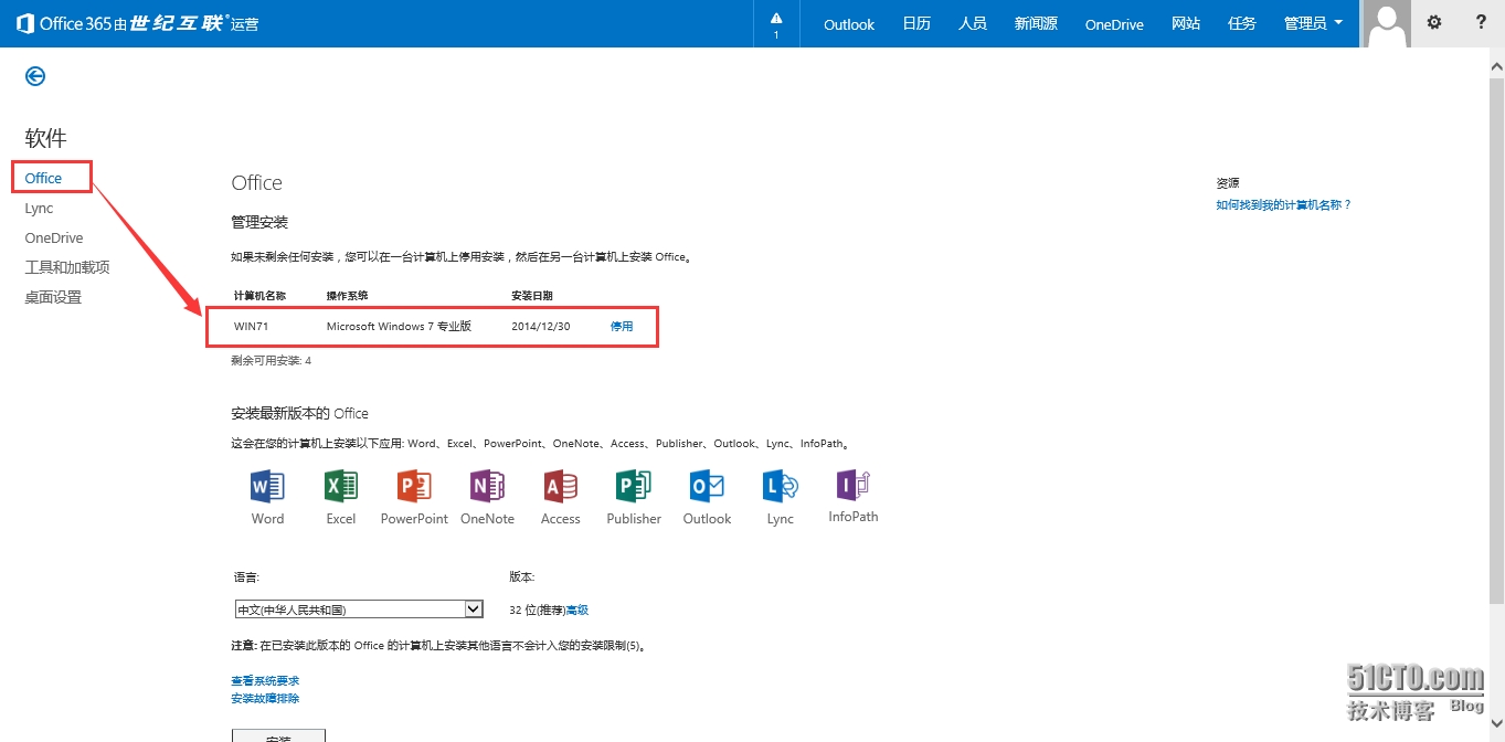 - 用账号Cici@Wangld.com登录O365,找到Office365 设置,在软件选项中可看到刚刚添加的计算机
