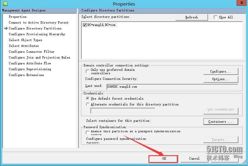 4.2 在目录同步计算机上打开miisclient, 默认路径在”C:\Program Files\Windows Azure Active DirectorySync\SYNCBUS\Synchronization Service\UIShell” 切换到“Management Agents”,右键“Active DirectoryConnector”选择“Properties”