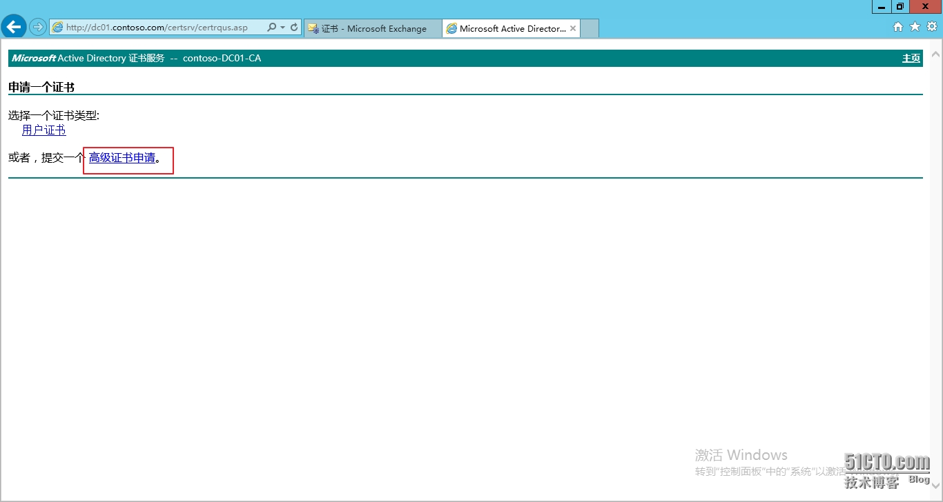 之前的实验环境都已经搭建的差不多了,基本上我们已经可以开始一些测试的过程了,但是因为我们没有申请由CA颁发的证书,默认情况下Exchange使用的只是自签名证书,是不会被客户端信任的,所以我们向要申请一张受域内计算机信任的证书。