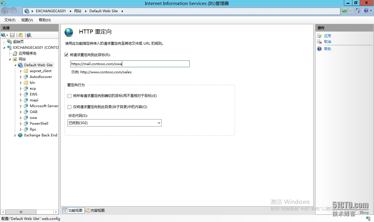 默认情况下,只有输入https://mail.contoso.com/owa或者是https://mail.contoso.com/ecp 才能登陆owa或者是ecp,这对用户体验来说是很不友好的,可以通过配置IIS重定向来实现自动的跳转