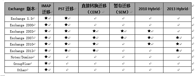 l 目前内部部署电子邮件组织是Exchange 2003 或 Exchange 2007。暂存迁移不支持迁移 Exchange 2010 或Exchange 2013 邮箱。