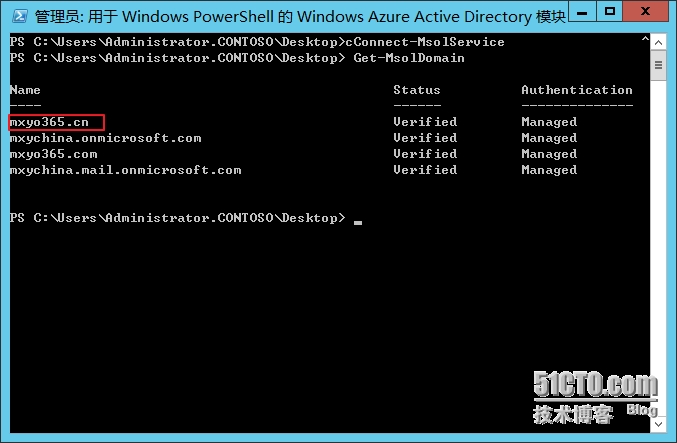 10.输入Get-MsolDomain查看现在绑定的域名