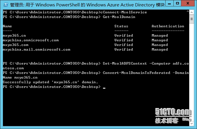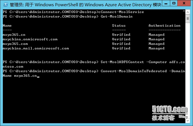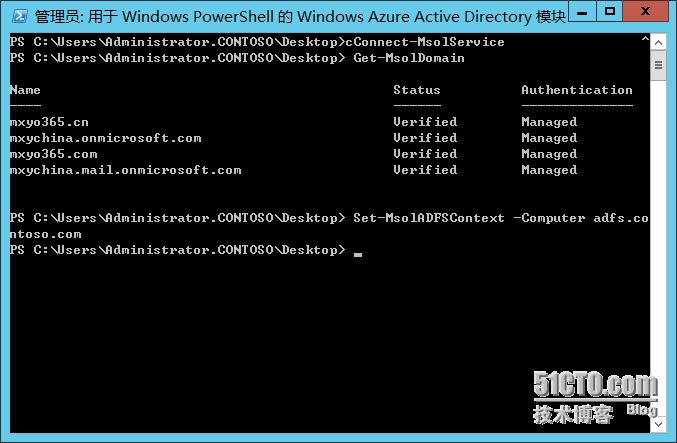 11.输入Set-MsolADFSContext –Computer adfs.contoso.com连接到ADFS服务器