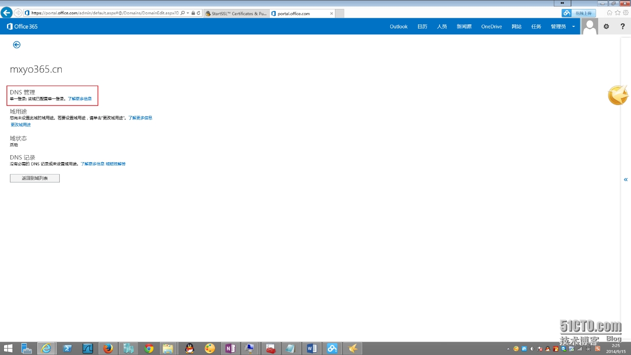 14.登陆Office 365管理中心,查看域可以看到该域已经被设置为单点登录域