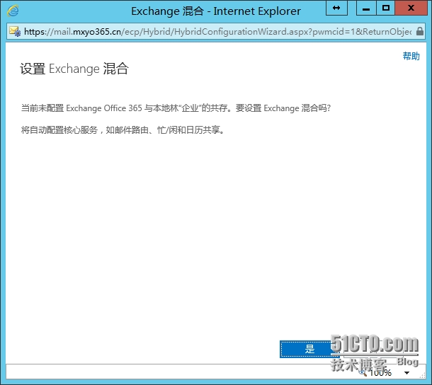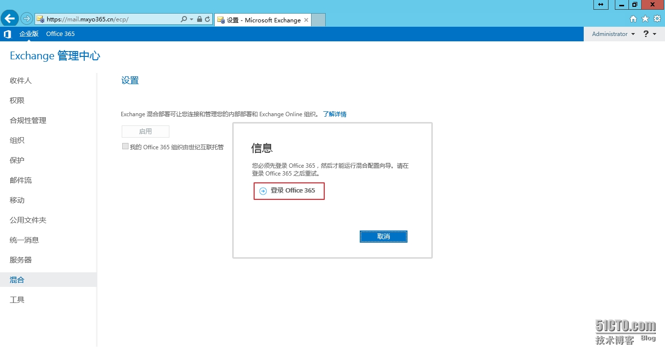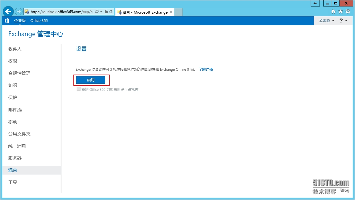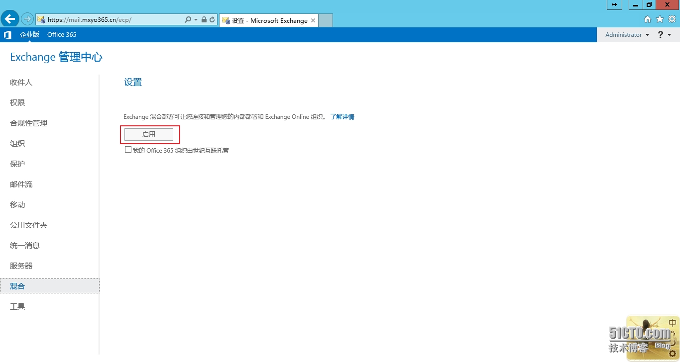 1.在本地的Exchange中,打开ECP,找到混合,点击启用