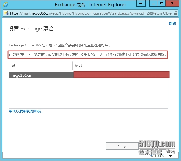 6.注意这里会要求在公网的DNS上添加一段TXT记录,证明域名的所有权,要注意的是这段记录不要直接复制粘贴,而是要把TXT IN这些都去掉,只保留后边的一串字符也可以打开EMS,输入Get-FederatedDomainProof -DomainName <域名>Proof里那段就是我们需要添加的TXT记录