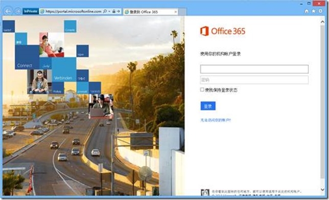 打开浏览器(支持IE、Firefox、Safari、Chrome等内核浏览器),输入:https://portal.microsoftonline.com,并在输入企业为用户分配的用户名和密码,点击登录按钮