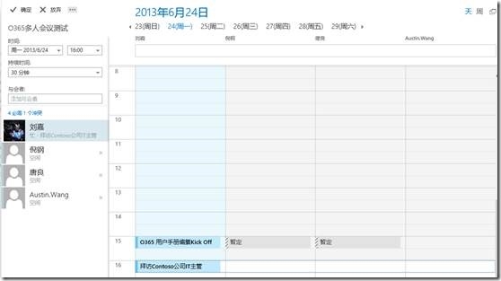 你会发现在预期的开会时间点(16:00)上有一个参会人已经有日程安排了,需要会议发起方再另行安排会议时间。只要通过一定的行政指令,让公司所有拥有O365账号的员工都把日历使用起来,那么贵公司以后的会议安排将会是一个简单的过程。不再会有时间冲突的会议邀请发出了。