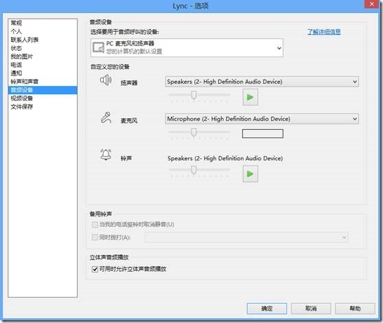 如果您的计算机配有麦克风和扬声器,便可以使用 Microsoft Lync 2013 进行语音呼叫。您可以插入贵公司推荐使用的任何设备,例如 USB 耳机、USB 电话或话筒——Lync 会自动配置您的设备。要检查您的音频设置,请单击选项