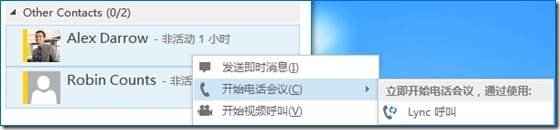 按住 Ctrl 键后,单击想要呼叫的联系人。随后右键单击,并选择 开始电话会议,在子菜单中选择Lync呼叫,向他们同时发出呼叫。