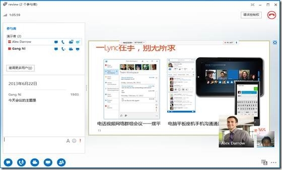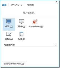 您可以在会议中共享您的桌面、应用程序、PowerPoint 演示,或者与其他用户在一个虚拟白板上开展工作。