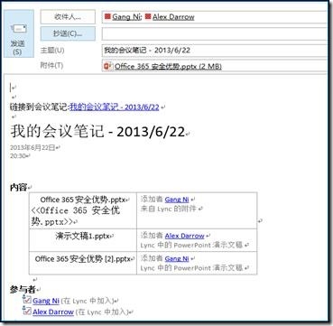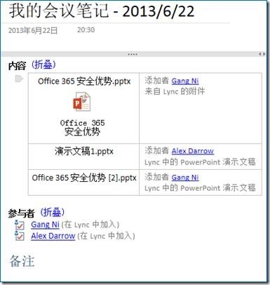 4. 开始记录会议内容,并且您可以看到Onenote已经自动记录了与会人员,会议共享的内容及上传的附件