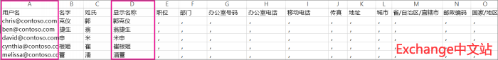 - 我是否需要与样本电子表格中的相同的列标题? 是的。样本电子表格中包含第一行的列标题。这些标题是必需的。对于要添加到 Office 365 的每位用户,您可以在标题下为其创建一行。如果添加、更改或删除任何列标题,Office 365 可能无法根据文件中的信息创建用户。