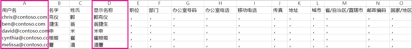 您的电子表格需要包含与样本电子表格相同的列标题。 还需要包含各用户的用户名(如 bob@contoso.com)和显示名称(如 Bob Kelly)的值。 若要将其他字段保留为空,请在相应字段中输入空格加逗号,如下图中所示。