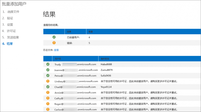 10、您可以以后购买更多许可证,然后使用同一个电子表格重新运行“批量添加用户”向导。 该向导将跳过已有帐户的用户;在结果报告中,它将显示“重复用户名”,说明带该信息的用户已经拥有一个帐户。