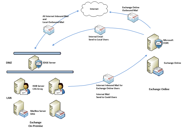 由于Office365的组件比较多,本系列重点讨论Exchange Online服务,规划的混合部署网络图如下: