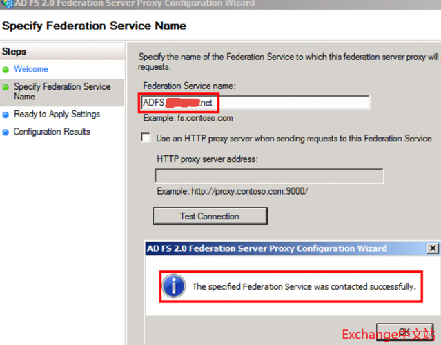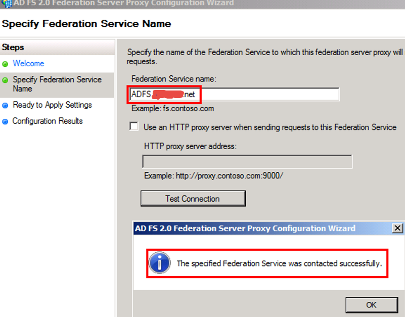 - 输入之前创建的ADFS服务器别名,测试连接是否成功。