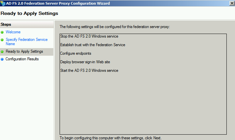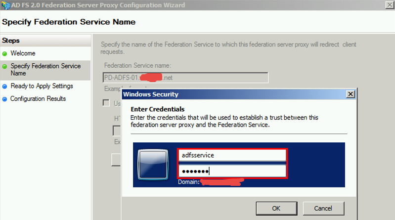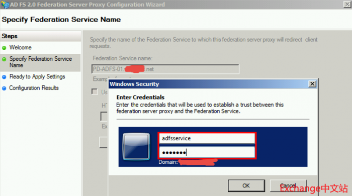 - 输入之前创建的ADFS服务账号,按下列图示完成配置向导。