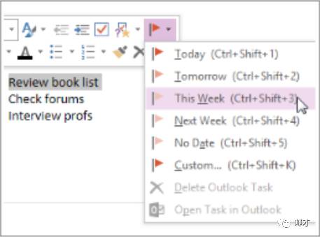- 将Onenote转换为事件或任务:Onenote是非常好用的工具,多标签,随想随记,随记随同步。现在这个组件还能关联Outlook任务,惊不惊喜?操作办法就是,选中Onenote任意标签中的任意字符串,右键点击选择计划完成时间就会在Outlook里面生成一个任务项,定时提醒你了。