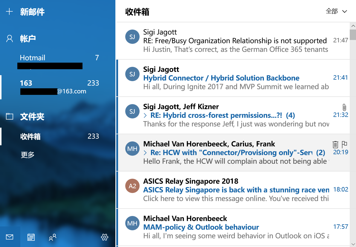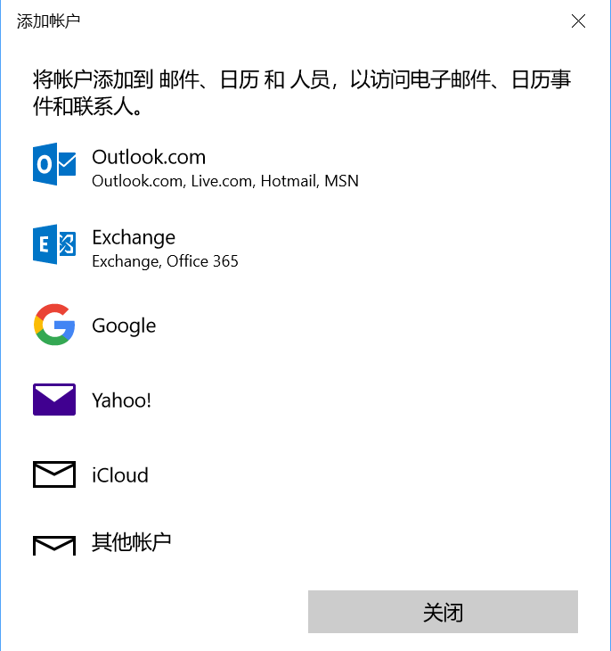 Win10系统跟邮件相关的共有三个模块:人脉、日历和邮件。以上三个模块都关联到同一套邮箱账号,可以在任意模块里做账号的增删改查