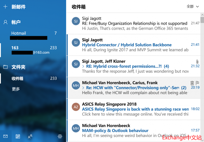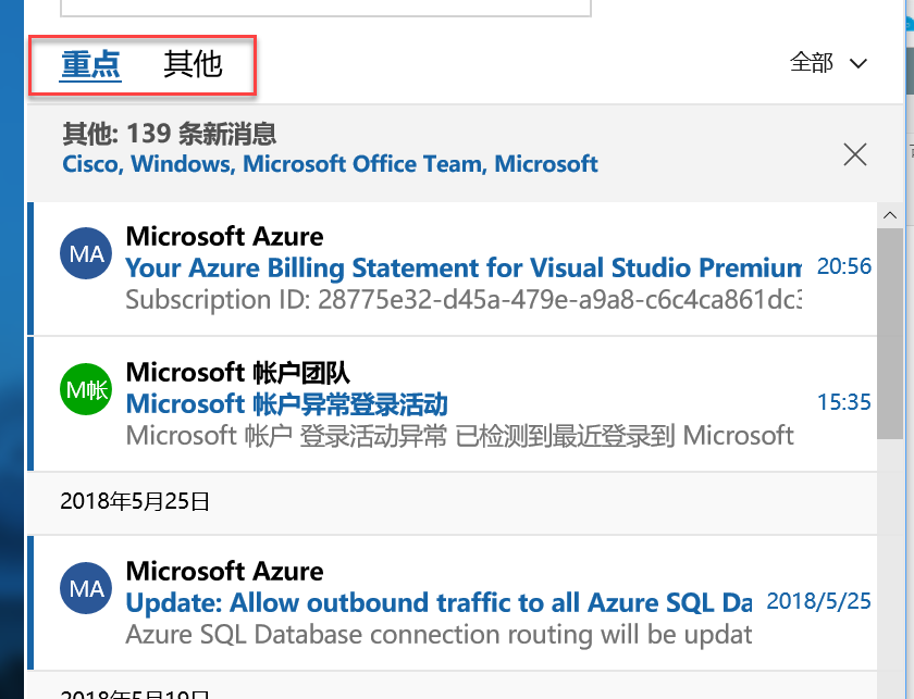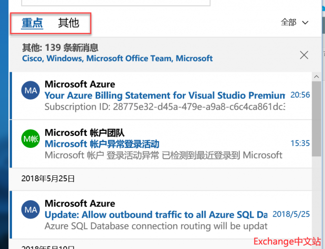 小编在上一篇分享中说了,Office365进一步把收件箱分为了重点(Focus)和其他(Others),这个自带的客户端继承了这个归类。