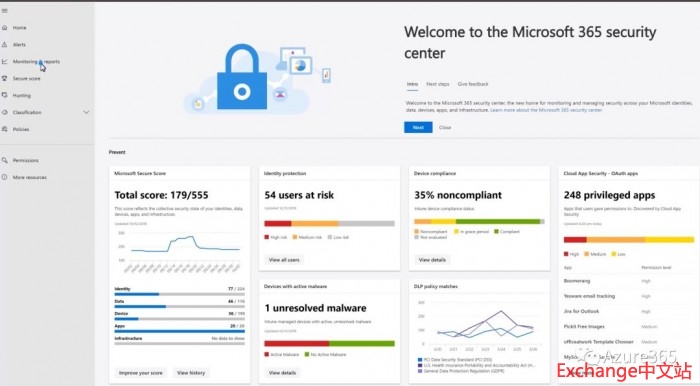 接下来一些零星的功能例如网页版Outlook通过人工智能(同样是基于Azure的认知服务)将用户相关的sharepoint文件、邮件往来设置自动代办项并自动更新;跨平台多客户端的实时视频会议(支持Yammer、Stream和Teams用户同时拨入);Microsoft Forms和Streams的集成;M365安全中心的新界面这里就不一一赘述了。